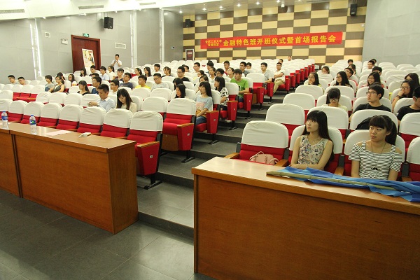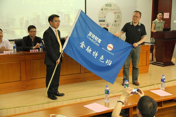 开班仪式上公司党委副书记胡晓浩和宜信财富管理二部总监助理曹明先生分别致辞对金融特色班的开展寄予了厚望;之后,双方授旗揭牌,宣布金融特色班正式开班;仪式结束后宜信财富财富管理二部东一区首席财富管理专家陈庆明为学员做了《互联网改变金融》专题报告会。