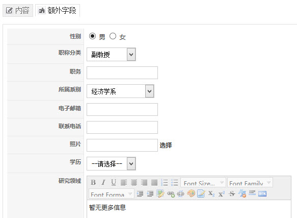教职员工信息也是文章的一中,但比普通文章增加了一些特殊的字段信息,所以在发布和修改的时候也有需要特别注意的地方。