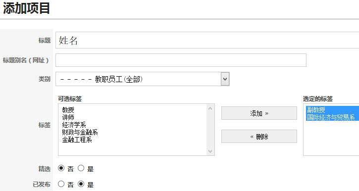 - 根据教职员工职称和所在系别,选择便签,如副教授、经济学系。这个标签用于按系别和职称分类显示时的类别识别。