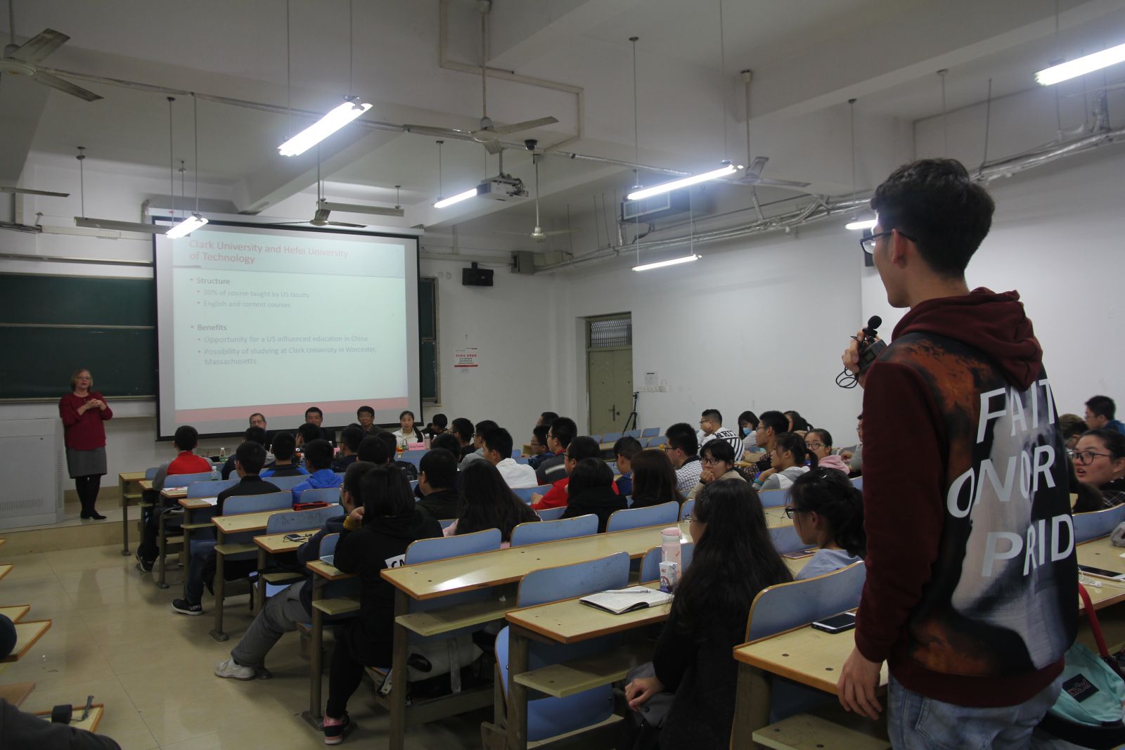 活动起始,Amy Gardner向员工们介绍了克拉克大学以及两校合作项目的概况,并且对项目员工的大学规划给出了建议。接下来的员工提问环节,员工们围绕克拉克大学的住宿环境、饮食状况、“3+1+1”项目的具体选拔标准与要求、课堂规模与教学方式、在美国留学的优势条件以及硕士项目介绍等方面踊跃提问,克拉克大学代表们一一进行详细回答,并且准备了许多精美礼品奖励提问的同学。最后国际经济与贸易(中美合作办学)2016级员工代表闵瑞中以及王虔用流利的英文做了精彩的演讲。活动现场热烈欢快,氛围轻松愉悦。