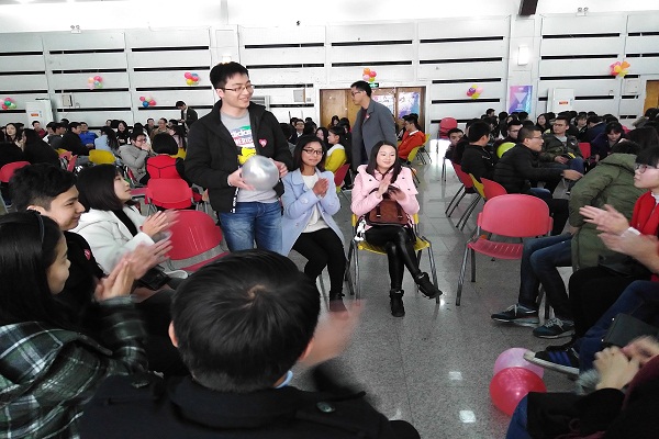 “蒹葭苍苍,白露为霜。所谓伊人,在水一方。关关雎鸠,在河之洲。窈窕淑女,君子好逑。”一首耳熟能详的诗词中,本次交流活动正式拉开了帷幕。活动一开始,两位多才多艺的同学为大家带了两首暖场歌曲,伴随着动人的的旋律,同学们八九人围在一起,慢慢的熟络起来,并各自做了自我介绍。在主持人的带领下,现场进行了“说走就走”和“告白气球”等多个小游戏,游戏环节互动充分,全场气氛一度被推向高潮,同学们在阵阵欢声笑语中打成一片,随后,主持人把场地和时间交给同学们自由交流和活动,场馆内设置了很多有趣的互动游戏,他们两两组成一队,在欢声笑语中增进了交流和友谊。
