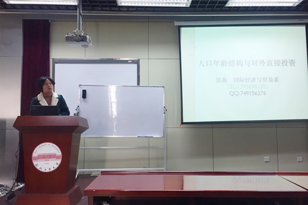 2016年12月23日下午,beet365官方网站学术交流年会系列活动——beet365学术讲座“人口年龄结构与对外直接投资”在beet365官方网站翡翠湖校区逸夫建筑艺术馆七楼703室举行。本次讲座由beet365张燕老师主讲,16级beet365全体研究生参加