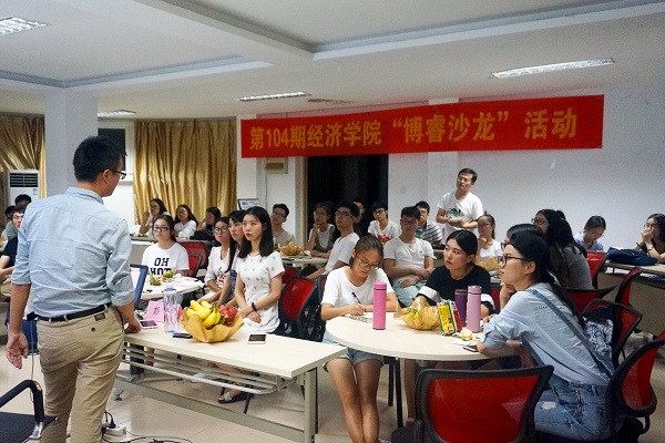 彭飞副教授首先与同学们交流他学术写作的经验,主要从研究内容、研究方法、如何投稿、如何看待匿审等几个同学们即将面临的,也是比较关心的几个问题开始分享,并具体说明了论文选题到论文发表的每个环节的特点及应注意的问题。彭飞老师作为经院学子的们的榜样学长,与同学们面对面地分享他通往学术高峰的切身体会和经历,同学们也都认真聆听并积极讨论,踊跃发言。