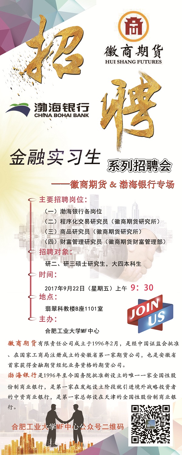 • 为了加强校企合作,服务于本院研究生和本科生毕业生。公司MF中心联合徽商期货公司和渤海银行合肥分行,将于2017年9月22日上午9点30在翡翠科研楼B座1101举办“金融实习生系列招聘会之徽商期货&渤海银行专场”,欢迎全院研二、研三以及大四员工参加。主要招聘岗位如下:(一)渤海银行各岗位;(二)程序化交易员(徽商期货研究所);(三)商品研究员(徽商期货研究所);(四)财富管理研究员(徽商期货财富管理部)。