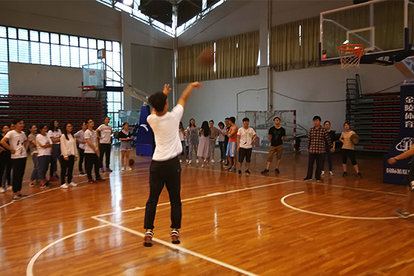 即使是雨天也并没有削弱同学们踊跃参与的激情。活动还没开始,就已经有很多同学提前到场地热身。等参赛人员都到齐后,活动正式开始。全部活动由四个部分组成,分别为夹球接力赛,天旋神射手,师生三分球赛,师生篮球比赛。
