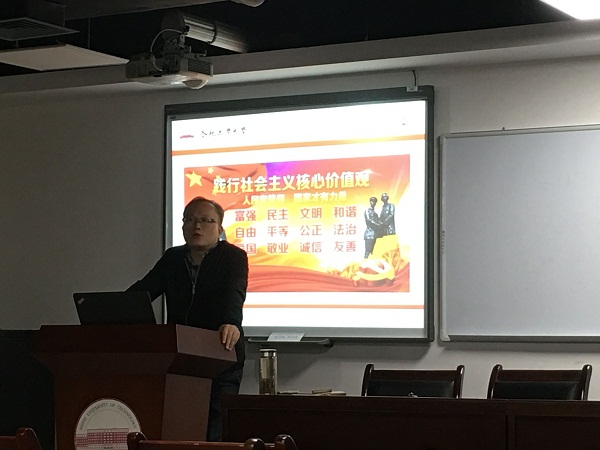 胡晓浩老师首先从国家、社会、公民三个层面阐述了社会主义核心价值观的内涵,他着重强调公民层面的价值观内容——爱国、敬业、诚信、友善。希望广大同学能够严格要求自己,规范自己的言行,自觉抵制网络上不真实的诋毁国家的言论,做到爱国爱党;要努力把学习、工作做到最好,落实工大精神;作为经济人,要时时刻刻要将诚信放在心中;作为班级的一份子,要努力促进班级和谐,寝室和睦。胡晓浩老师的阐述贴近生活,在场同学受益匪浅。