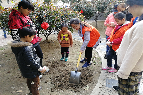 首先,青年志愿者们指导儿童俱乐部的孩子们制作了各种样式的卡片,并带领孩子们剪去旧的树标、挂起新的卡片。随后,大家有序的加入植树活动,志愿者和孩子们手持铁锹松土,装土选种并为树苗施肥灌溉营养液。最后,大家把种植好的树苗放置在阳光能照射到的地方,而每一位小朋友也都拥有一株属于自己的小树苗。活动结束后,志愿者们与孩子们合影留念。