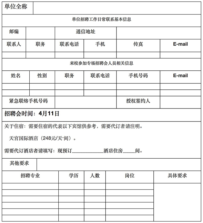 1、洽谈时间:2018年4月11日上午9:00~12:00;下午各单位可根据各自情况安排笔试、面试。