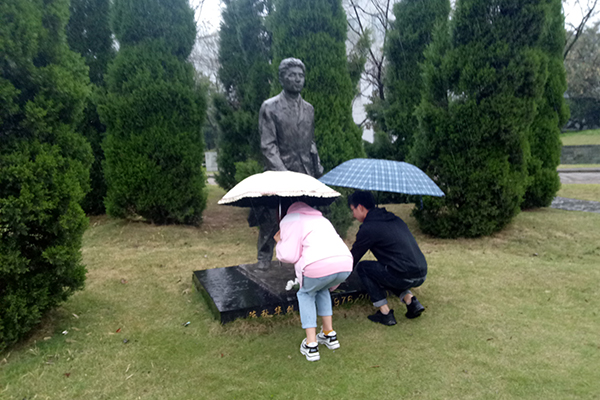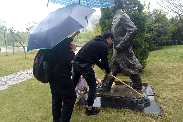 4月5日上午9点整,伴着绵绵细雨,志愿者们来到翡翠湖校区俪人湖畔陈秋华烈士雕像前。在解说员详细介绍陈秋华烈士的英勇事迹后,大家都深受感动并表达对陈秋华烈士的崇高敬意。随后,志愿者们纷纷在烈士塑像前献花,并向烈士塑像三鞠躬,以表敬意。在向陈秋华烈士致敬后,志愿者们又为烈士塑像进行了清扫,用实际行动表达了自己对烈士的追思与缅怀。