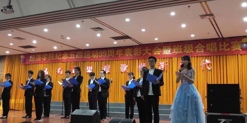 合唱比赛分必唱曲目《光荣啊,中国共青团》和自选曲目两个环节。七个班级先后上场,激情昂扬的共青团团歌七次在报告厅响起,歌声令人动容,催人奋进。自选曲目表达了同学们对家国和党的热爱,对青春和生命的热爱。中外17-2班合唱歌曲《天耀中华》,歌声深情而悠扬,富有感染力,中外17-3班合唱了歌曲《国家》,在合唱中融入舞蹈、手语等元素,金融工程17-2班结合朗诵、手语等形式演绎了歌曲《中国》,同学们通过质朴真诚的表演,表达了对国家的真挚热爱的感情。国际经济与贸易17-1班采用二重唱的形式合唱一曲《没有共产党就没有新中国》,经典的旋律经过同学们的认真演绎,充满感染力。经济学17-1班合唱歌曲《让世界充满爱》,中外17-1班表演了《骄傲的少年》,金融工程17-1班带来充满个性的《追梦赤子心》,歌曲展现了同学们青春洋溢、充满自信的面貌,表达了同学们对未来和自由的渴望。比赛形式丰富多样,各班级采用朗诵、手语、舞蹈、乐器演奏等形式配合合唱,充分展现了同学们的多才多艺与大胆创新的精神。最后,经过评审,中外国贸17-2班获得合唱比赛一等奖,中外国贸17-1班、金融工程17-1班获得二等奖。