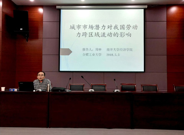 5月5日下午,在翡翠科技楼第五会议室,周申教授为公司师生做了一场主题为《城市市场潜力对我国劳动力跨区域流动的影响》的精彩学术报告,此次报告由张先锋副经理主持,近七十名公司师生聆听了此次报告。在此次报告中,周申教授从我国劳动人口跨区域流动日益频繁和当下各地吸引高层次人才政策不断出台等现实背景出发,从理论和实证两个层面较为系统地剖析了我国城市市场潜力对劳动力跨区域流动的影响,并着重从城市层面和个体微观层面,利用大样本微观数据多角度考察城市市场潜力对我国劳动力跨区域流动的经验影响,还探讨这种影响效应在劳动力特征上的个体差异性。在此次报告中,公司师生还与周申教授就该报告内容进行了精彩的问答互动。