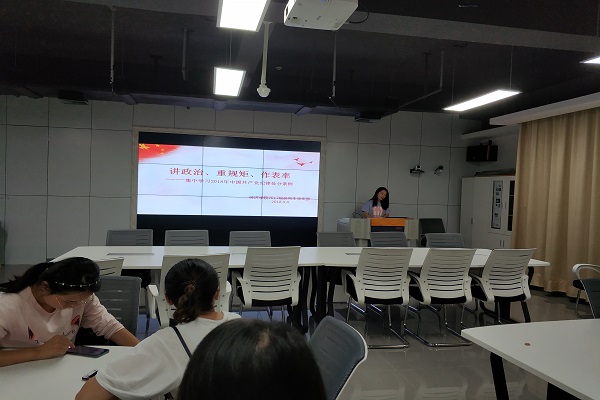 大会开始,胡甜甜同志汇报了此次党课支部党员与会的情况。会议伊始,胡甜甜支部书记对《中国共产党纪律处分条例》(以下简称《条例》)修订的必要性进行阐述,加强纪律建设是全面从严治党的治本之策,中国特色社会主义进入了新时代,党要有新气象新作为,必须靠严明的纪律作保证。其次,总结《条例》修订历史,通过修订变化过程,感受《条例》的与时俱进与不断发展,展现《条例》对党员愈发严格的约束。紧接着,胡甜甜支部书记着重介绍2018版新《条例》的特点,包括“一个思想”,“两个坚决维护”,“三个重点”,“四个意识”,“四种形态”,“五处纪法衔接”,“六个从严”,“七个有之”,“八种典型违纪行为”。最后,结合厦门大学“精日”研究生被开除党籍退学的案例列举可能被开除党籍的45种行为,提醒党员加强目前和未来生活工作学习的行为约束。