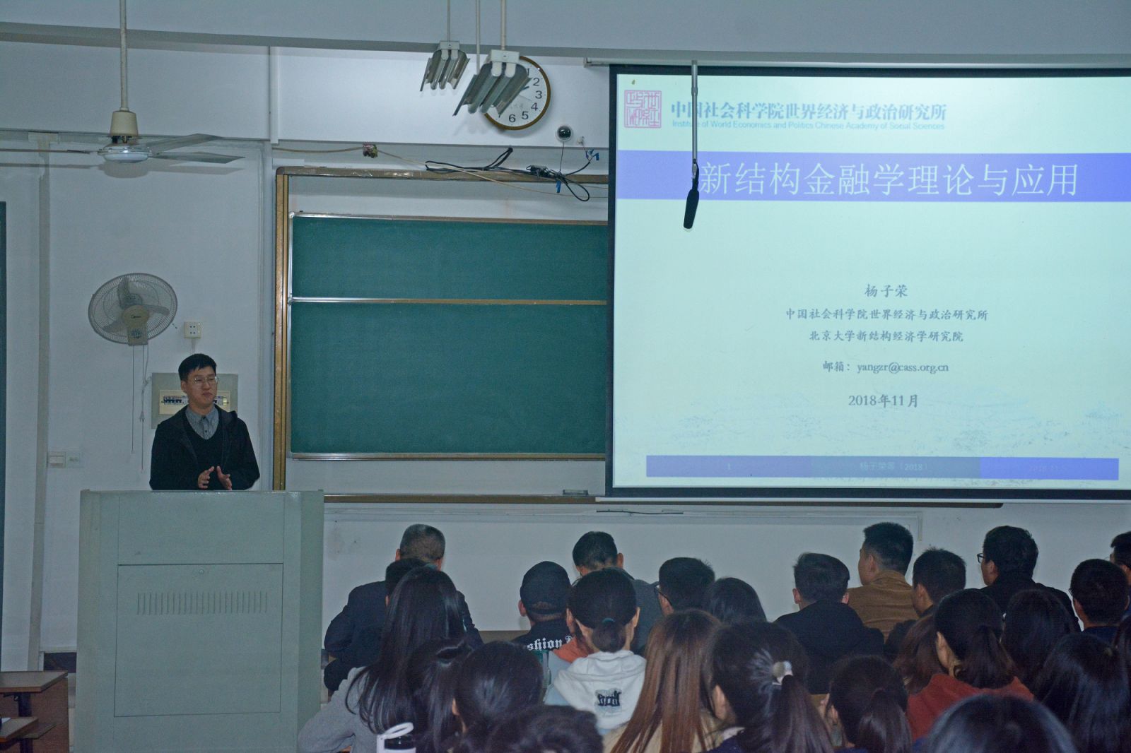 讲座由安徽大学经济学金融学系货币银行教研室邓道才主任主持。杨子荣博士首先与中美贸易战为切入点,与同学们讨论了中美贸易战的相关问题。包括中美关系的政治与经济基础、中美贸易摩擦、美国发起贸易战的目的以及中国应如何应对、未来如何演化等。杨子荣博士在简单介绍主流发展经济学的相关内容之后详细讲述了新结构经济学的相关内容,包括新结构经济学的研究内容、理论基础、主流理论和中国金融结构的问题等。在互动环节,杨子荣博士对同学们提出的问题进行了详细解答。最后,杨子荣博士以林毅夫先生的“致年轻人:有抓住自己这个时代所给予的机会,如果希望有点成就,那总是要比别人更努力一些”勉励了在座的各位同学。