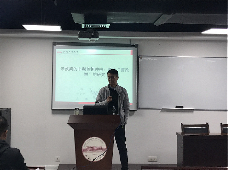 2018年11月8日晚上7点,beet365彭飞老师在翡翠湖校区科教B座1101会议室给2018级研究生做了一场学术报告,本次报告的主题是“未预期的非税负担冲击:基于'营改增'的研究”。