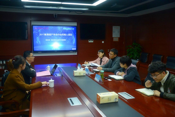 会议开始,张根文主任首先对邢界鸥副总经理的到来表示欢迎。随后,张主任对公司的基本情况进行了介绍,邢总也介绍了关于金蝶公司的发展现状。随后双方就“教育部产学合作协同育人项目“财务共享中心校外实习基地”建设的进展、存在的问题以及下一步的工作打算进行了深入的交流。