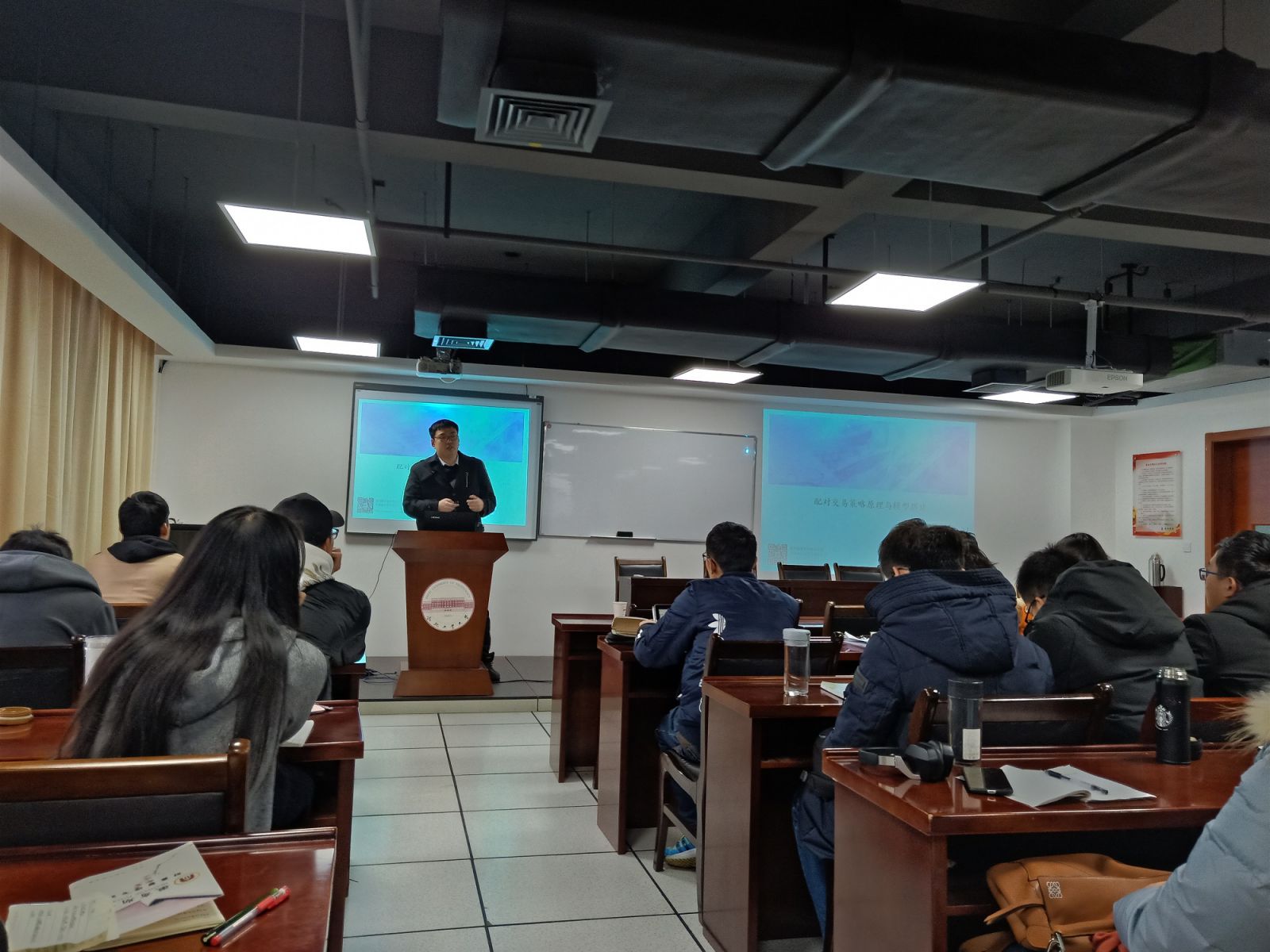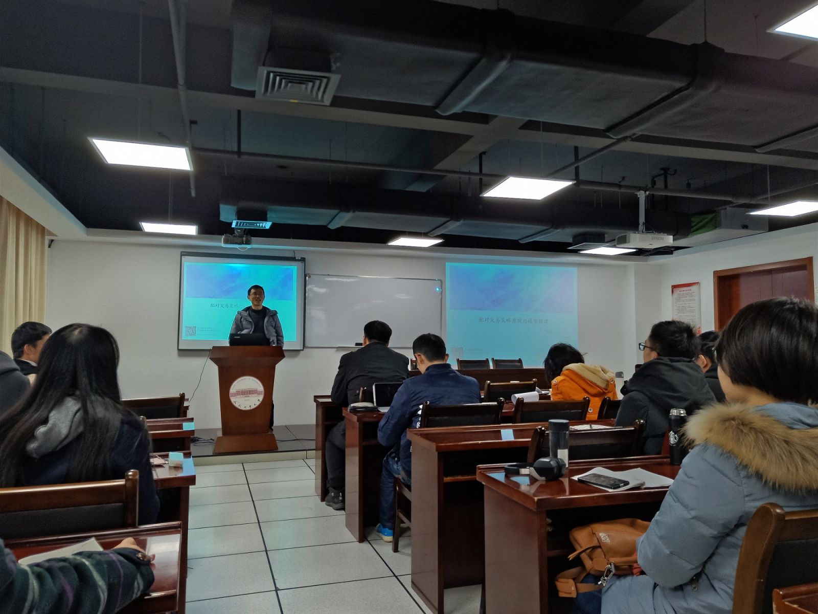 2018年12月9日上午8点30分,量化投资系列课程讲座首次课程于翡翠湖校区科教楼B座1101室开展。本次课程讲座的主题是“配对交易策略原理和模型搭建”。徽商期货研究所的策略分析师刘琳博士担任此次课程讲座讲师,MF中心主任张根文老师出席了此次讲座。