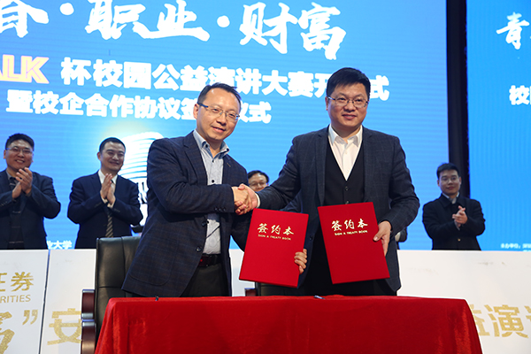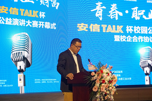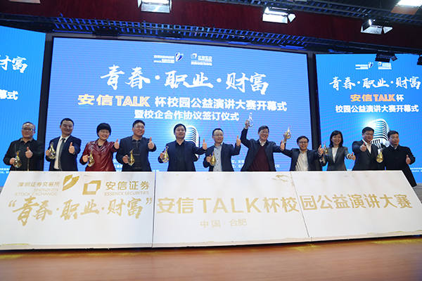 4月1日晚19:00,“安信Talk”杯安徽省老员工校园公益演讲大赛开幕式暨校企合作协议签订仪式在公司翡翠湖校区科教楼A座报告厅举行。深圳交易所投资教育中心总监徐良平、中国证监会安徽证监局投资者保护工作处处长杨柳、芜湖市地方金融管理局副主任陈国、安信证券安徽分公司总经理胡勇以及公司党委宣传部、党委学工部、团委、beet365相关负责人等出席本次活动。
