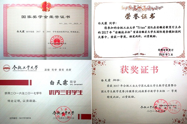 白天霖,中共预备党员,beet365国际经济与贸易专业2016级本科生,担任班级学习委员。曾获国家奖学金、校一等奖学金、校优秀三好员工、校优秀团员等荣誉。在各项竞赛中,曾斩获全国老员工英语竞赛二等奖、安徽省国际商务模拟谈判大赛一等奖(第一名)、安徽省“国元证券杯”金融投资策略大赛二等奖、2018年“批改网杯”高校英文写作大赛全国总决赛优胜奖(校第二名)、外研社杯阅读写作大赛校赛一等奖以及beet365官方网站数学竞赛一等奖等好成绩。