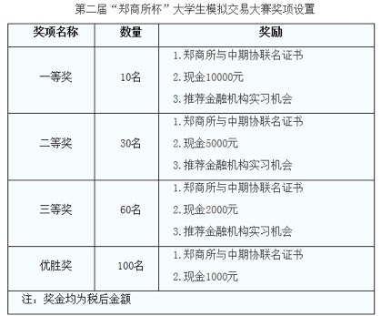 一等奖、二等奖、三等奖的获奖者可获得:(1)郑商所与中期协联合颁发的证书;(2)现金奖励;(3)推荐郑商所、中期协以及其它金融机构实习机会。其中,一等奖奖励税后10000元,二等奖奖励税后5000元,三等奖奖励税后2000元。