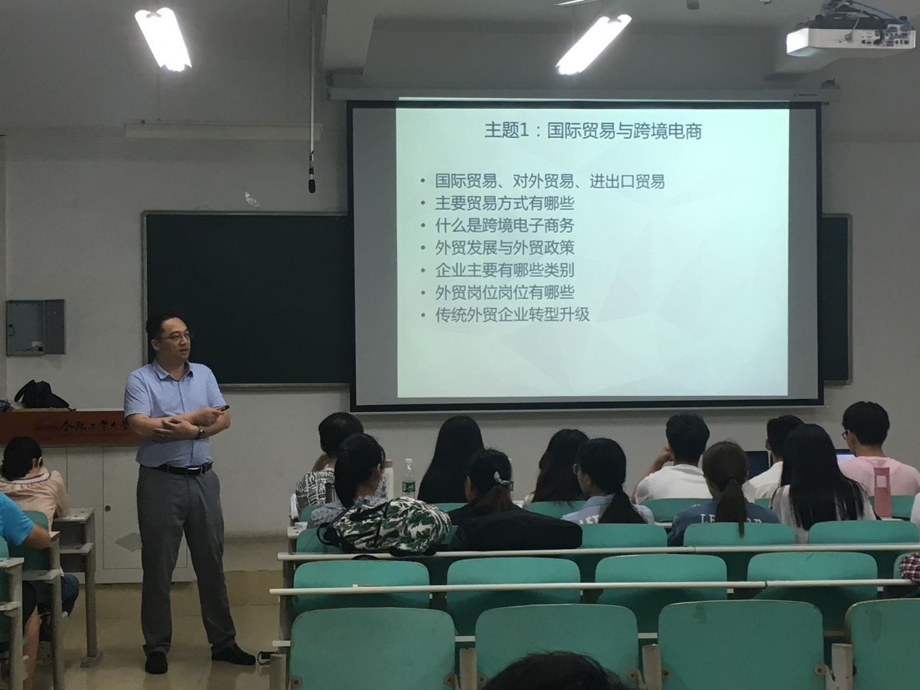 6月20日晚7点,中国国际贸易学会跨境电商教学工作委员会副主任、高级经济师王斌老师在翡翠湖校区科教楼7教403教室,进行了题为“‘互联网+外贸’新思维——兼论国际贸易专业学习创新”的讲座。报告由刘晴老师主持,公司部分老师和2017级国际经济与贸易(中外合作办学)专业全体同学一同聆听了讲座。