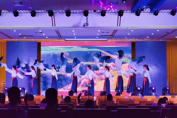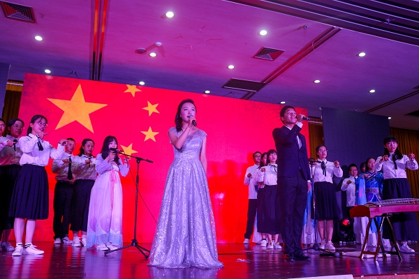第一篇章“炎黄浩瀚、锦绣中华”,金融工程19-1班的歌舞《千年华夏》,古典唯美,展现了中华传统文化的魅力。中外19-2班的节目《我和我的祖国》,通过归国音乐家的对话,引出了一曲曲动听的音乐、一段段曼妙的舞蹈,展现了中西文化碰撞交流的美。19级员工代表的诗朗诵更是表达了对祖国的无限赞美与热爱。