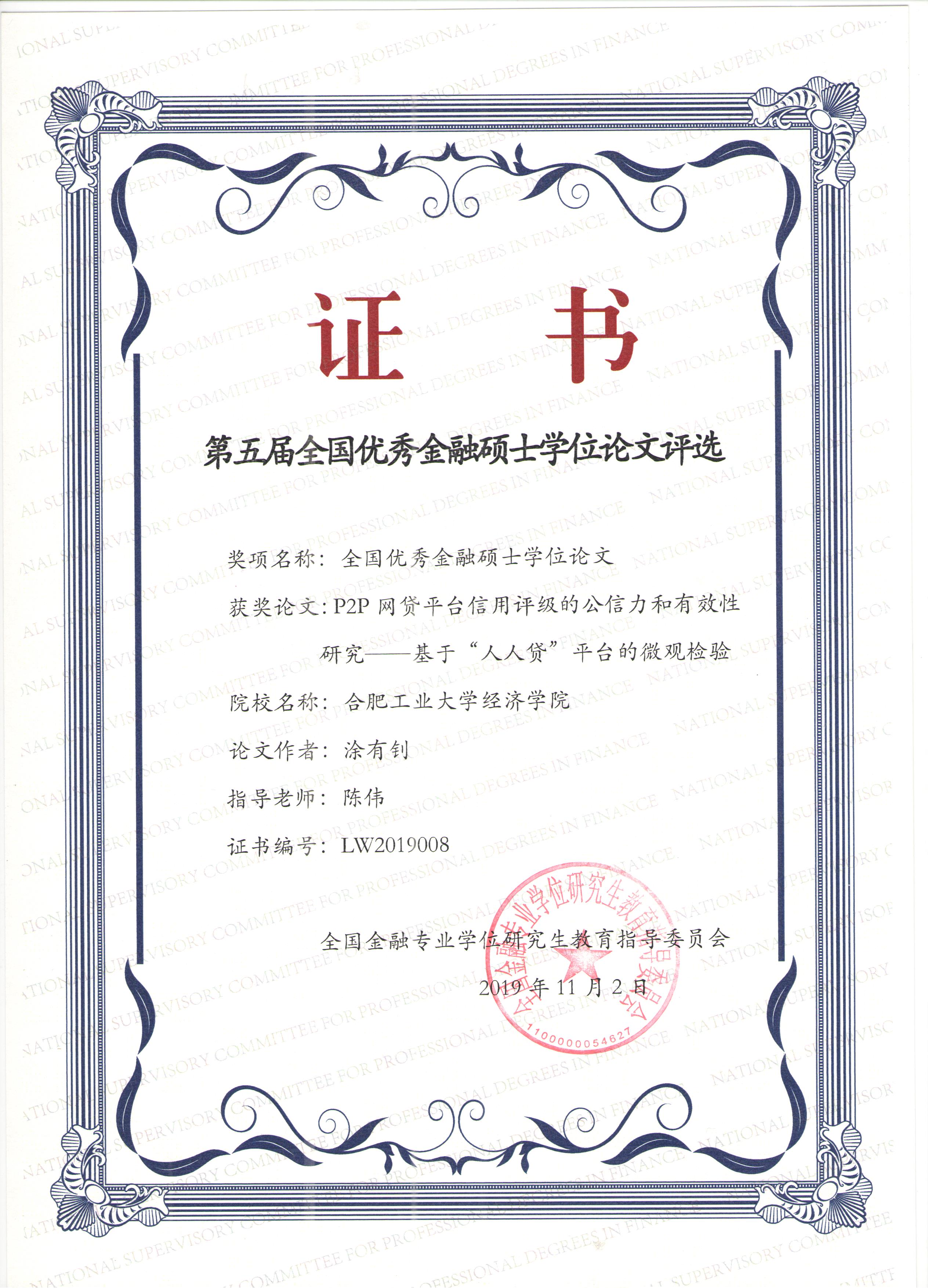 11月2日北京召开的“2019年全国金融专业学位研究生教育工作会议”公布了“第五届全国优秀金融硕士学位论文”评选结果,来自全国各金融硕士培养单位120篇参赛论文中的24篇获奖。公司陈伟老师指导、涂有钊完成的论文“P2P网贷平台信用评级的公信力和有效性研究——基于“人人贷”平台的微观检验”获评全国优秀金融硕士学位论文。