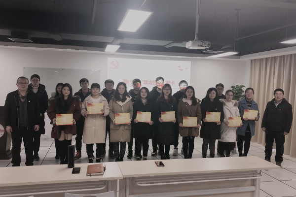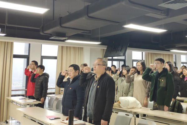 奏唱完《国际歌》后,在主持人的领誓下,新老党员在党旗下郑重宣誓,表达了为共产主义奋斗终身的理想。接着,预备党员代表张艳超进行了发言。她代表新入党的同志向党组织承诺:脚踏实地,跟党最贴近;放眼大局,拥党最坚定;廉洁自律,让党最放心;砥砺前行,时刻跟党走。之后,党员代表陈敬婷进行了发言。她表示会继续加强思想政治学习,在实践中积极探索,提高服务群众的本领和能力,充分发挥模范作用。之后,李金华和胡晓浩为12月加入党组织的同志们颁发了“政治生日”贺卡。最后,李金华做了讲话。他首先对加入党组织的同志们表示了祝贺,接着对新老党员提出了三点要求:一要牢记入党誓词,将入党誓词体现在行动之中;二要牢记党员身份,时刻发挥党员的先锋模范作用,为党做贡献;三要牢记责任,不断强化树牢“四个意识”、坚定“四个自信”、做到“两个维护”的责任担当,结合专业认真学习党的十九届四中全会精神,做到常学常新、真干真行。