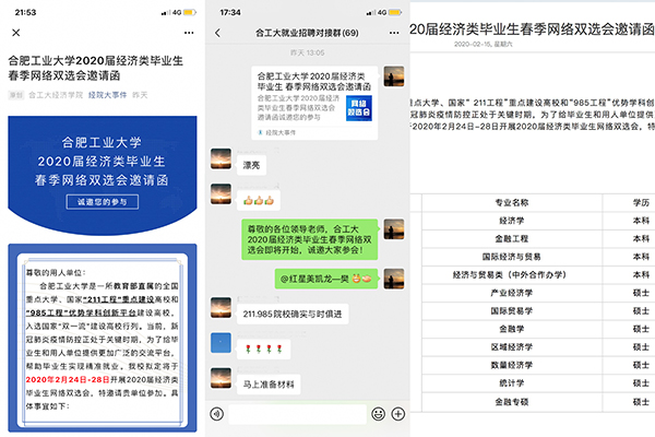 在前期充分调研毕业班员工就业意向和职业需求的基础上,2月15日,公司在全校率先发出2020届经济类毕业生春季网络双选会邀请函,邀请企业开展线上招聘。信息发布后的短短3天之内,就陆陆续续收到了国内20余家优质企业报名参会,为毕业生提供就业岗位超过100个。