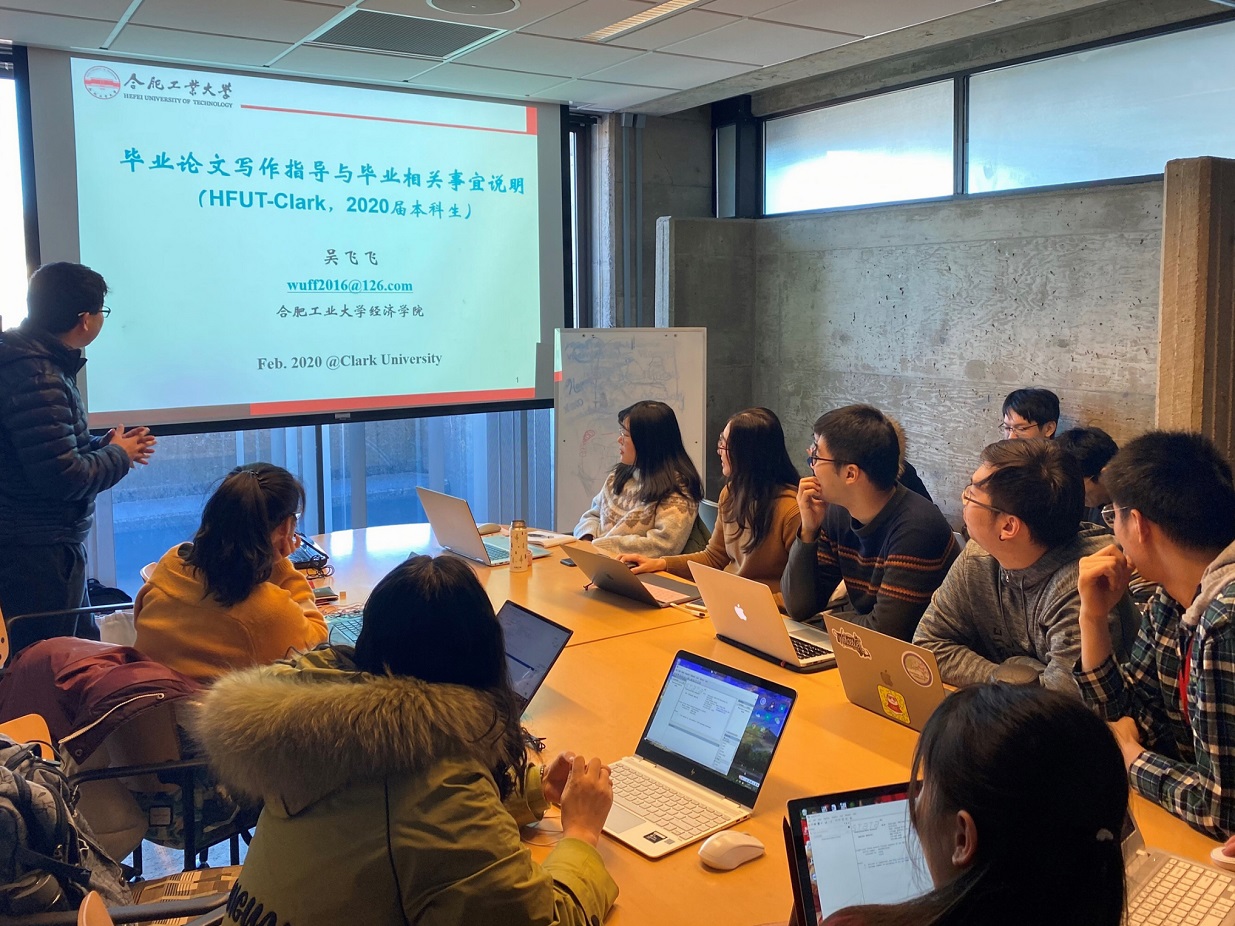 美国伍斯特当地时间2020年2月15日下午2时,公司在克拉克大学访学交流青年教师吴飞飞,于美国克拉克大学图书馆317会议室,为2016级国际经济与贸易(中外合作办学)专业的留学学子举办了一场题为“毕业论文写作指导与毕业相关事宜说明”的专题讲座。