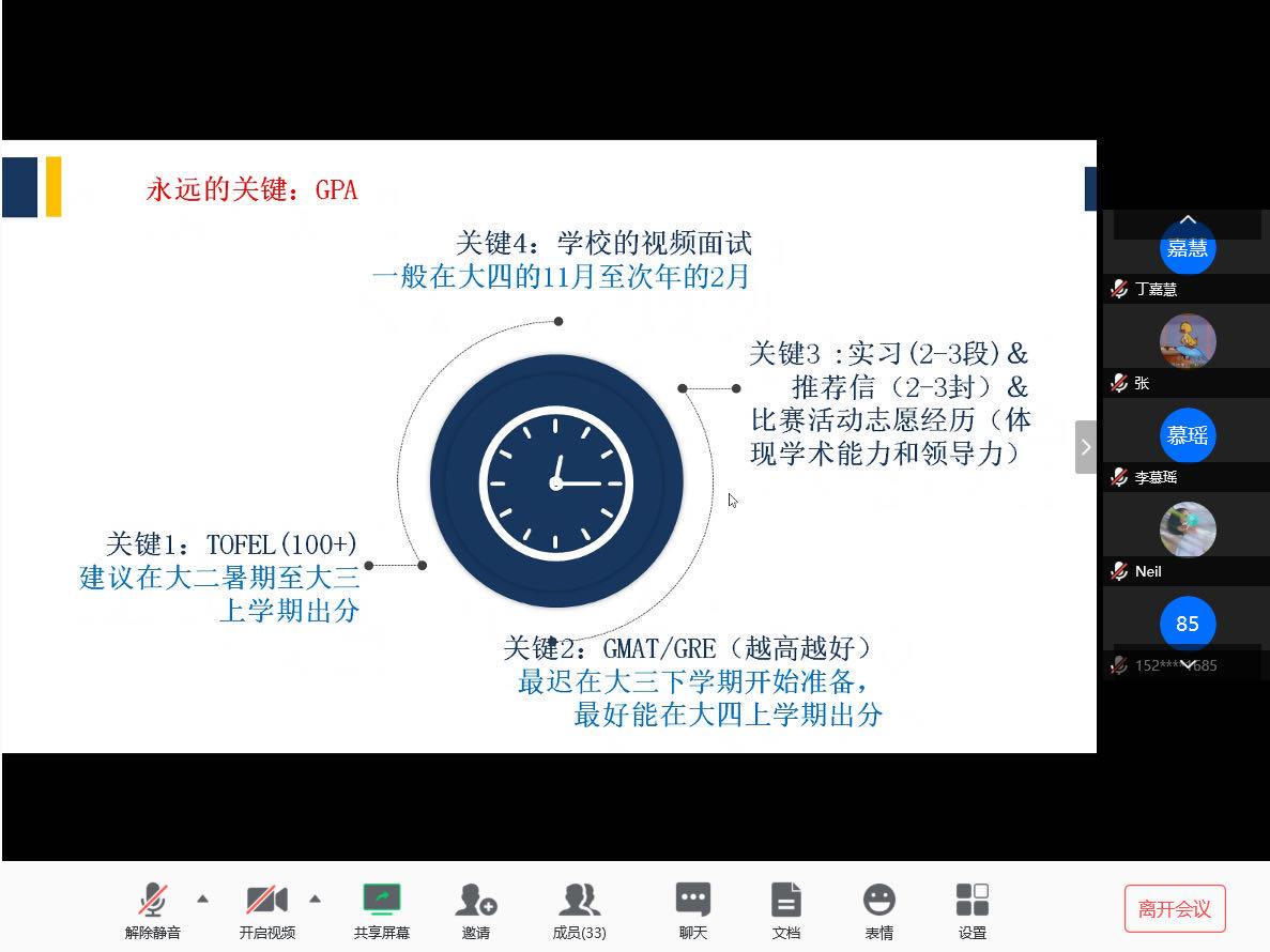 2020年3月18日,公司“卓越学子交流会第6期:美国研究生申请经验分享”成功举办,以腾讯会议形式进行。本次交流会特邀请公司中外国贸专业2016级卓越学子金胜尧同学进行分享,该生目前已获得约翰·霍普金斯大学、圣路易斯华盛顿大学、布兰迪斯大学录取通知书。