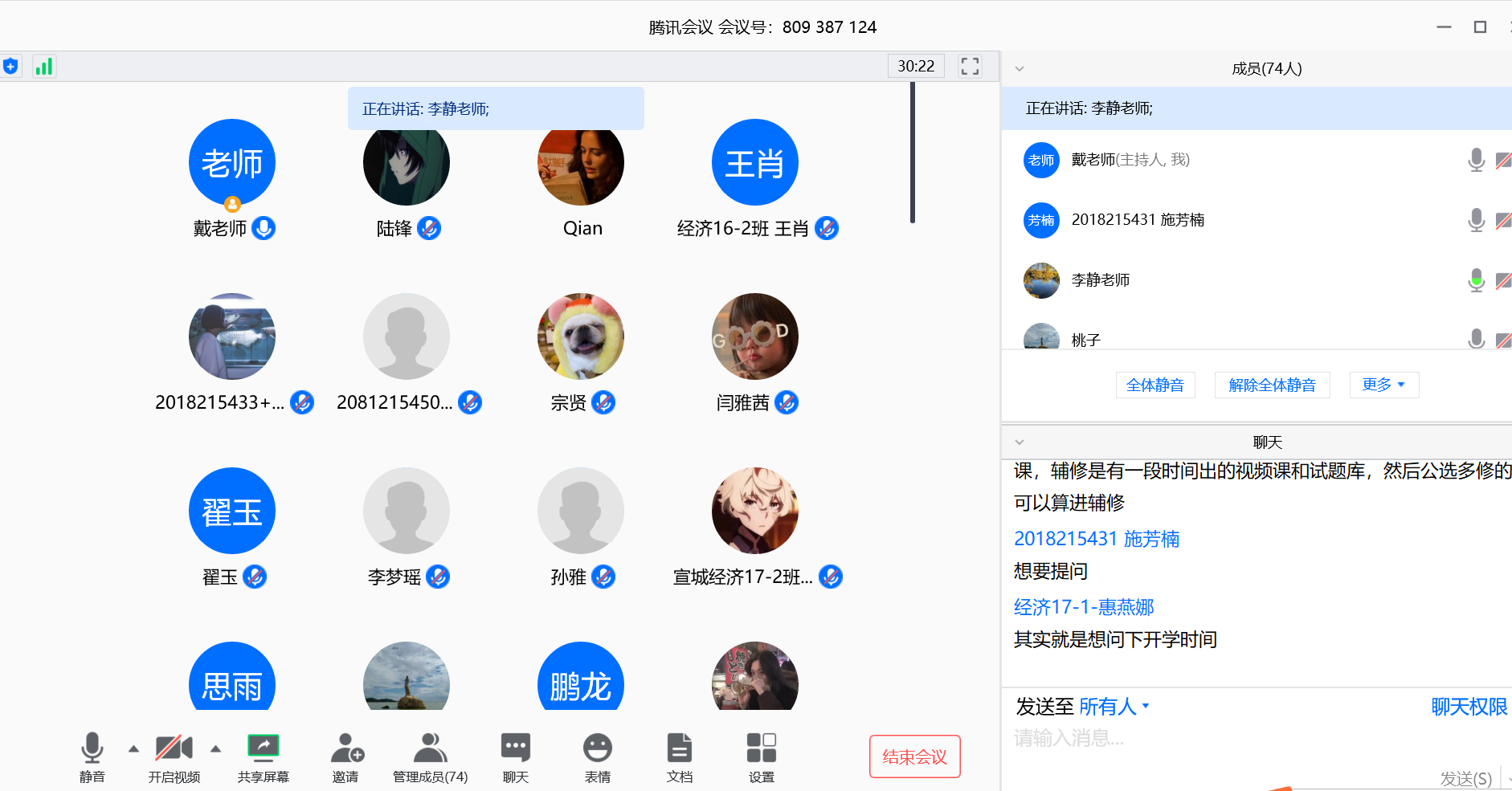 2020年4月15日下午两点,经济学教工支部组织开展经济学系师生线上座谈交流会。本次交流会在腾讯会议平台召开。会议邀请了9名教师参与座谈交流,包括经济学系主任李静教授,经贸系主任黄顺武教授,经济学系原主任、产业所长陶爱萍教授、实验教学中心主任娜仁副教授以及经济系教师李影、蒯鹏、刘晨跃、何心巨等,60余位各年级经济学专业员工代表(含宣城校区)参加会议。李金华书记指导了此次座谈会的组织工作,支部书记戴前智主持会议。