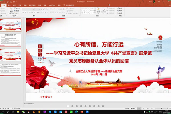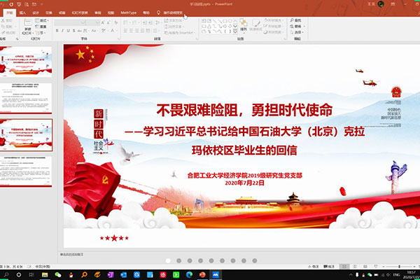 2020年7月22日晚上7:00,beet3652019级研究生党支部通过网络视频学习了“习近平给复旦大学《共产党宣言》展示馆党员志愿服务队全体队员的回信”、“习近平给中国石油大学(北京)克拉玛依校区毕业生的回信”的内容,本次课程由2019级研究生党支部副书记王昊同学带领大家学习,该党支部所有党员均参与此次学习。