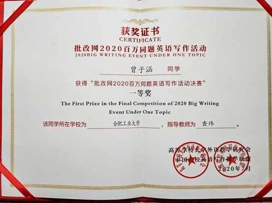 近日,第七届“批改网2020百万同题英语写作活动全国总决赛”结果揭晓,公司2019级国际经济与贸易(中外合作办学)专业学子曾子涵同学在此次竞赛中荣获一等奖,指导教师查玮荣获“优秀指导教师”奖。