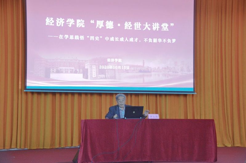 10月15日晚19:00,公司“厚德•经世大讲堂”主题报告会在翡翠湖校区综合楼301室举行。公司邀请钟玉海教授做了题为“在学思践悟‘四史’中成长成人成才,不负韶华不负梦”的主题报告。报告会由公司党委副书记、纪委书记谢晶晶主持,公司2020级全体本科生、党校第64期入党积极分子以及各年级辅导员300余人参加主题报告会。