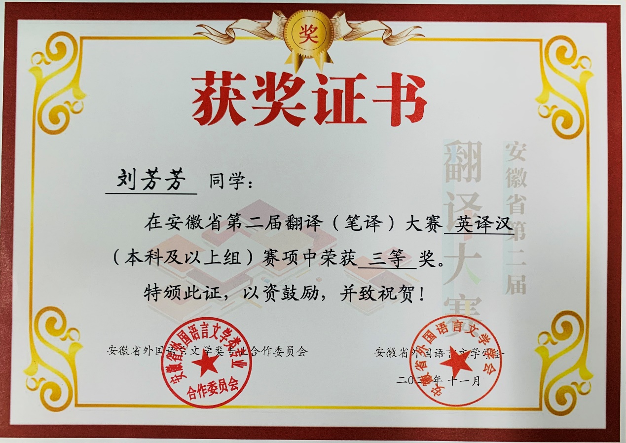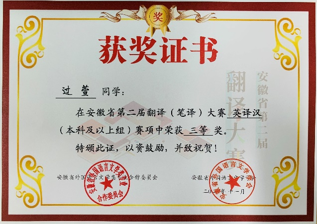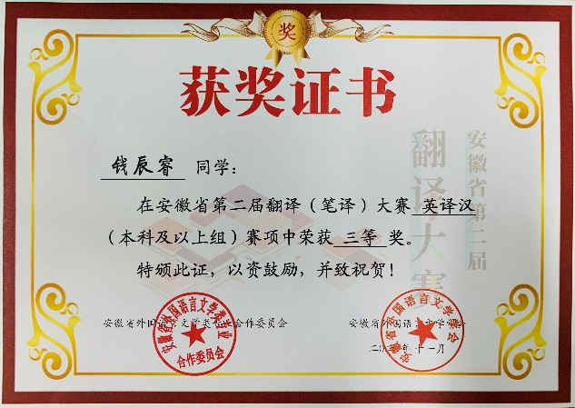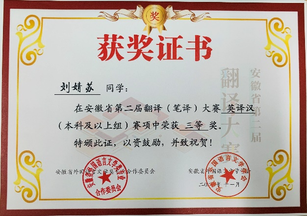 近日,安徽省第二届翻译(笔译)大赛圆满落幕。经过初赛、复赛两轮比赛的激烈角逐,公司2019级国际经济与贸易(中外合作办学)专业参赛队伍成功为公司赢得了多项荣誉。其中,王越月、过萱、刘芳芳、刘婧苏、钱辰睿荣获三等奖,汪可荣获优秀奖,指导教师查玮荣获“优秀指导教师”奖。