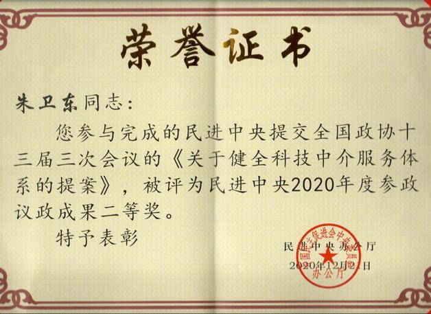 近日,公司民进基层委员会主委beet365朱卫东教授荣获民进中央委员会评选的民进全国履职能力建设先进个人称号。同时,他参与完成的民进中央提交全国政协十三届三次会议的《关于健全科技中介服务体系的提案》,被评为民进中央2020年度参政议政成果二等奖。