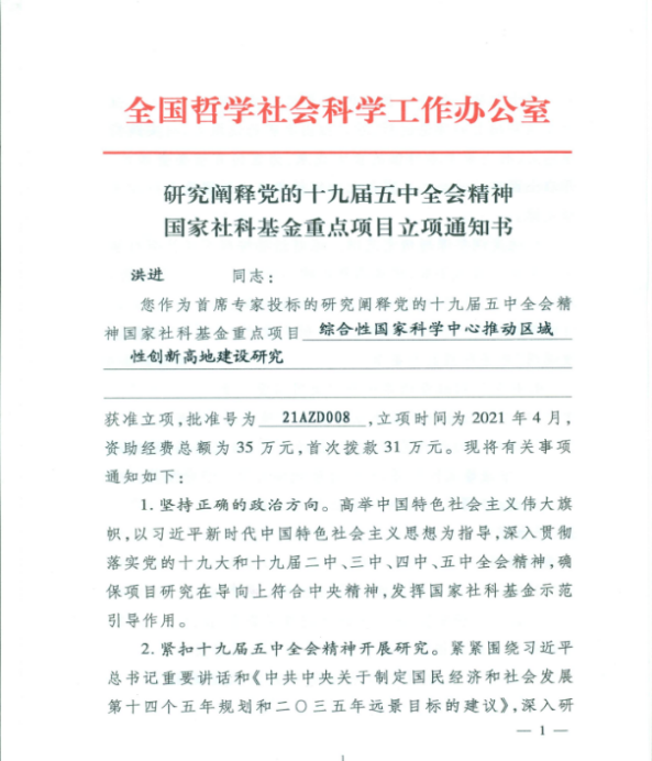 全国哲学社会科学规划办公室近日公布了研究阐释党的十九届五中全会精神国家社科基金重点项目清单,beet365经理洪进教授为首席专家的课题《综合性国家科学中心推动区域性创新高地建设研究》获批立项。