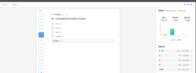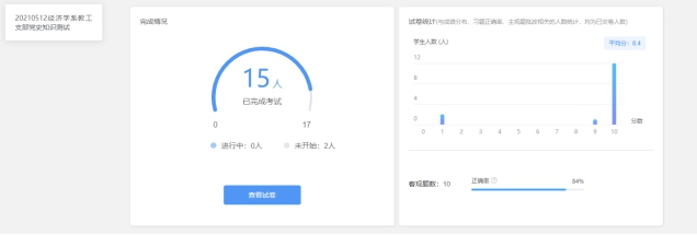 为响应公司党委组织部《关于开展庆祝建党 100 周年主题党日活动的通知》精神,5月12日,经济学系教工支部组织开展了党史知识测试活动。本次测试是对开展党史学习教育以来党员学习效果的一次检验,也是对支部前阶段党史理论学习的一次小结。测试的主要知识点为《中国共产党简史》第一章的内容,题型为选择题。由于经济学系教工支部担任宣城校区异地授课的教师数量较多,故使用雨课堂进行党史知识测试,使得因异地授课而无法参加现场集体学习的教工也能够参加测试。本次测试是经济学系教工支部对“智慧党建”的进一步尝试。