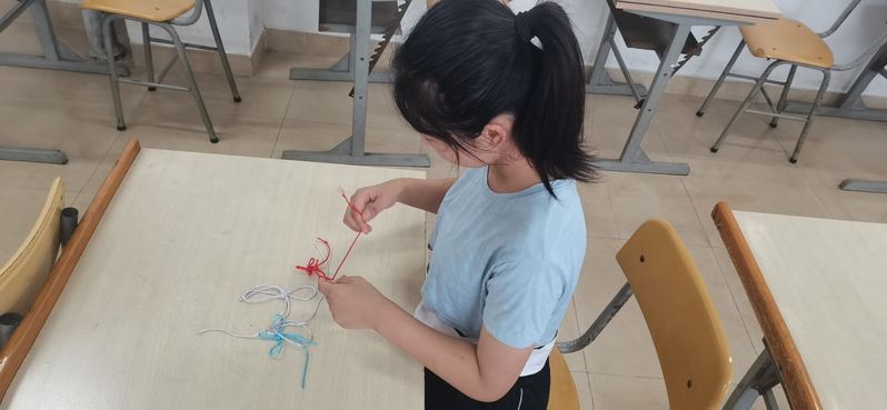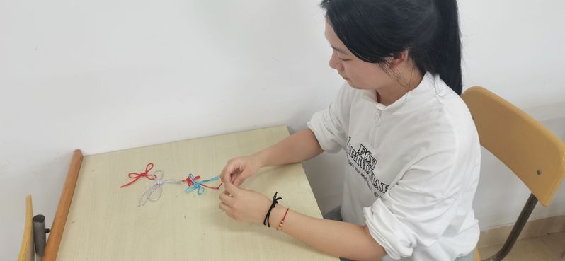 “巧盘诘曲同心纽,附绣回旋锦字诗。”盘扣是中国传统服饰中极具标志性的、不可或缺的一部分。活动当日,志愿者们早早抵达教室观看教学视频,在国学部干事的讲解之下认真学习编制盘扣。为给国祯书院的小朋友提供一份完美的礼物,他们仔细询问制作细节,耐心地进行一次次尝试。他们十指灵巧翻动,五彩的绳子不一会儿就被缠成圆润饱满的盘扣。