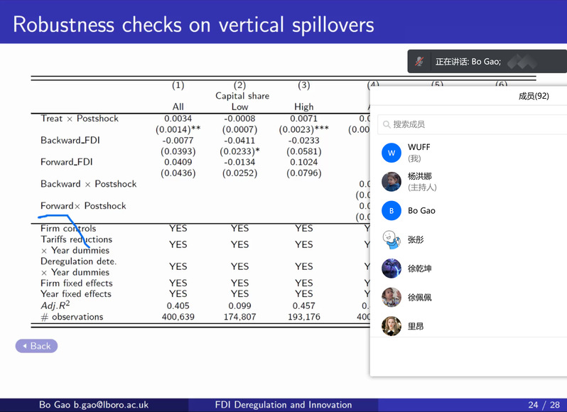 高博士报告的题目是《Firm Innovation and Foreign Investment Deregulation: Theory and Evidence from China's Patents》,研究了放松对外国投资的管制是否会促进企业的创新,并指出这是一个差异化的设置。本报告中,高博士建立了一个理论框架,其中包括由外商投资引起的更多外国公司的溢出效应和竞争效应,以指导实证评估工作。利用中国企业层面的专利数据和放松外资管制的政策,在差分设置中发现放松外资管制对企业创新有明显的正向影响。此外,高博士表明还存在一个稳健的异质性,即在高生产率的企业中影响突出,而在低生产率的企业中则不明显,这与理论框架是一致的。