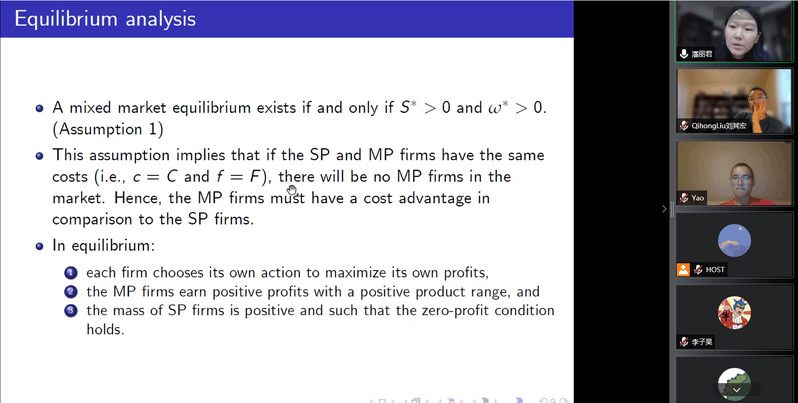 公司老师积极参与交流。陈紫若老师汇报了论文“External Shock, Export Product Mix and Firms’ Productivity”,这篇文章考察受外部冲击时多产品企业出口产品组合的调整机制及其对生产率的影响,并由潘丽君老师进行点评。刘晴老师汇报了论文“Trade Policy Uncertainty and Firms’ Domestic Sales:Evidence from China”,樊海潮教授进行了点评。随后,吴飞飞老师汇报了论文“Population Aging, Labor Market Distortion and the Evolution of Export Advantages”,并由周默涵老师进行点评。葛阳琴老师汇报了论文“GVC Embedment,Human Capital Accumulation and Labor Income Share”,并由林发勤老师进行点评。朱晨老师汇报了论文“Multidimensional Cultural Distance and Self-employment of Internal Migrants in China”,并由王欢欢老师给予点评。最后,吴飞飞老师对会议进行了简短的总结,感谢与会专家指导。