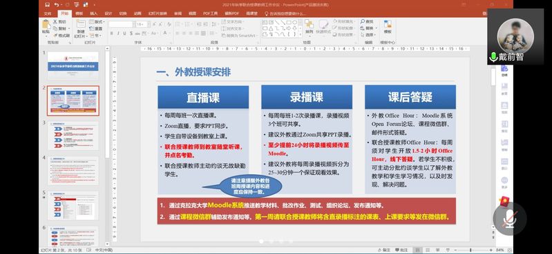 联合授课教师工作会议是公司中外合作办学项目的一项常态化工作,旨在加强对外教授课和联合授课教师助课的规范化和过程化管理,通过及时的问题反馈和解决,促进外教授课高质量平稳有序进行。同时,通过总结经验教训和集思广益,有助于不断探索实践线上线下教学新方法和新模式。