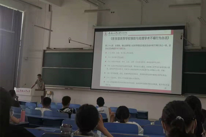 张先锋以“我们究竟要培养什么样的研究生?”为主题,从对beet365的科研条件、团队力量和员工就业去向等的介绍入手,与同学们分享了最新的研究成果,并且强调“研究生要有成为企业与社会精英的抱负,要勇于肩负社会责任”。随后,彭飞对同学们进行了学术道德与学风建设教育,重点为大家详细解读了学术行为不端的相关文件,希望同学们做有一个干干净净学术人。最后,彭飞结合自身的经历和同学们分享了论文写作方法,希望同学们在今后的学习中能够不断提升科研能力。