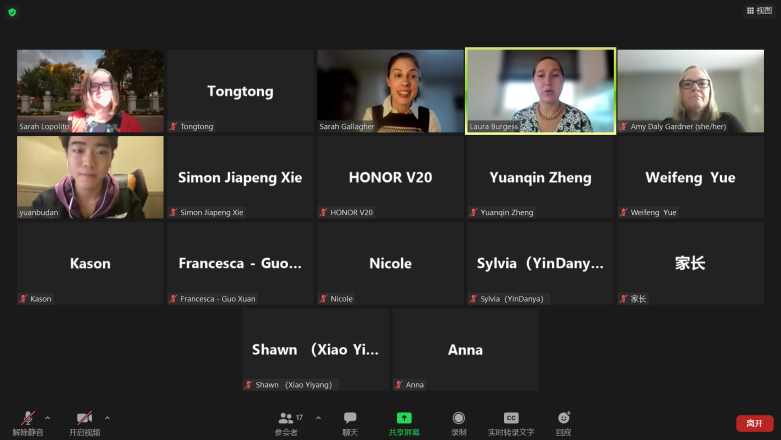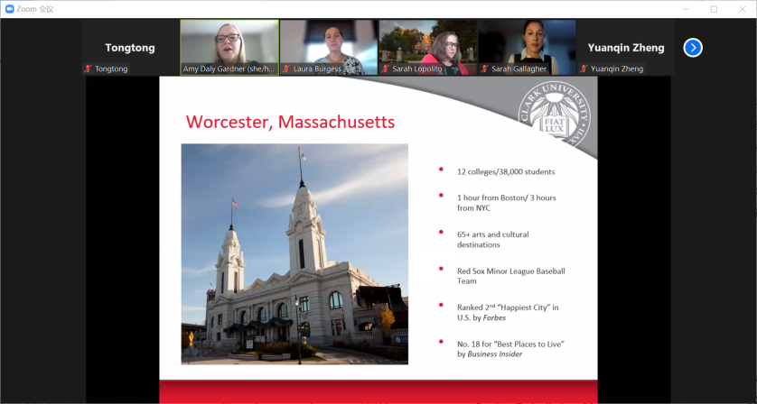 11月11日晚,美国克拉克大学代表与国际经济与贸易(中外合作办学)专业2019级员工见面会在线上Zoom平台顺利召开。克拉克大学国际教育项目副经理Amy Daly Gardner、国际教育项目助理经理Sarah Lopolito、公司国际教育中心副主任郑园琴、2019级中外国贸员工以及部分员工家长等共同参加会议。