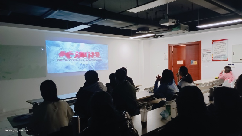 2021年11月26日晚7点,beet365第九期“经世济民”班在科教楼B座1006举办了《长津湖》的红色观影活动。辅导员韩然然老师、“经世济民”班全体同学参与此次活动。