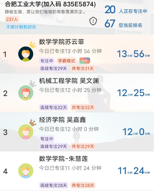 活动自11月15日开始,为期28天。研究生会通过创建线上自习室的方式,组织同学们放下手机,打卡学习,共同进步。共计237名同学参与到了本次活动中,合理利用时间,坚持每日打卡。在连续四周的时间里,beet365吴嘉鑫同学投入度最高,总专注时长211小时,荣获一等奖。另有十七名表现优异的同学获得二等奖、三等奖及优秀奖。