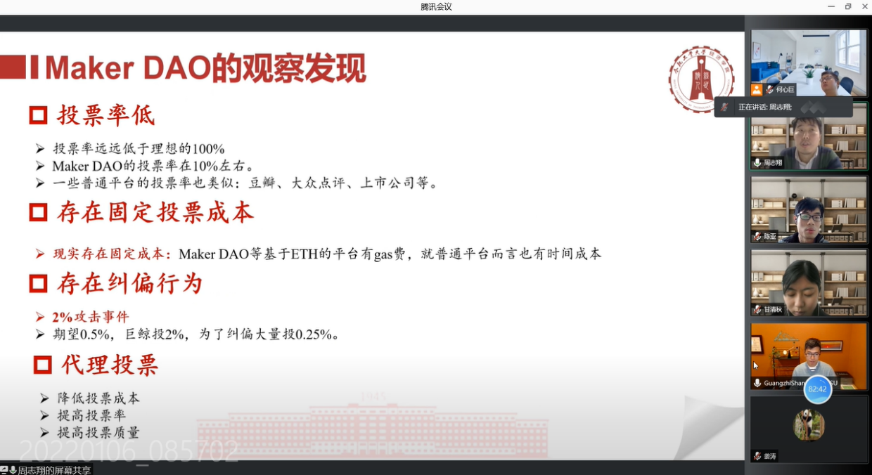 区块链系列网络研讨会共10场,汇报相关前沿文献共18篇,进行主题汇报10次,涉及Bitcoin、Ethereum、NFT、DAO、ICO等多个区块链相关领域或平台。研讨会由beet365学术交流中心主任何心巨主持,公司教师周志翔、陈亚参与研讨,美国佛罗里达州立大学商公司副教授尚广志应邀作为点评嘉宾,公司研究生积极参与,学术研讨氛围热烈浓厚。