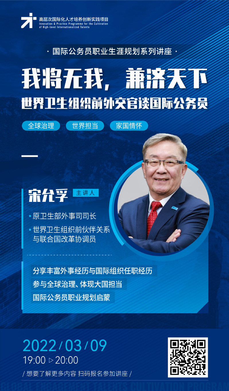 此次讲座为国际公务员职业生涯规划系列讲座第一场,由原卫生部外事司司长、世界卫生组织前伙伴关系与联合国改革协调员宋允孚先生担任主讲嘉宾。宋司长十八岁留学海外,有十四年国际组织任职经历,以及四十余年的外事工作经验。本场讲座将从全球治理、世界担当、家国情怀三个方面,分享国际组织经历,分享全球治理的心得体会,带来国际公务员的职业规划启蒙,鼓励老员工培养家国情怀与国际视野,把握时代机遇,迎接全球挑战!