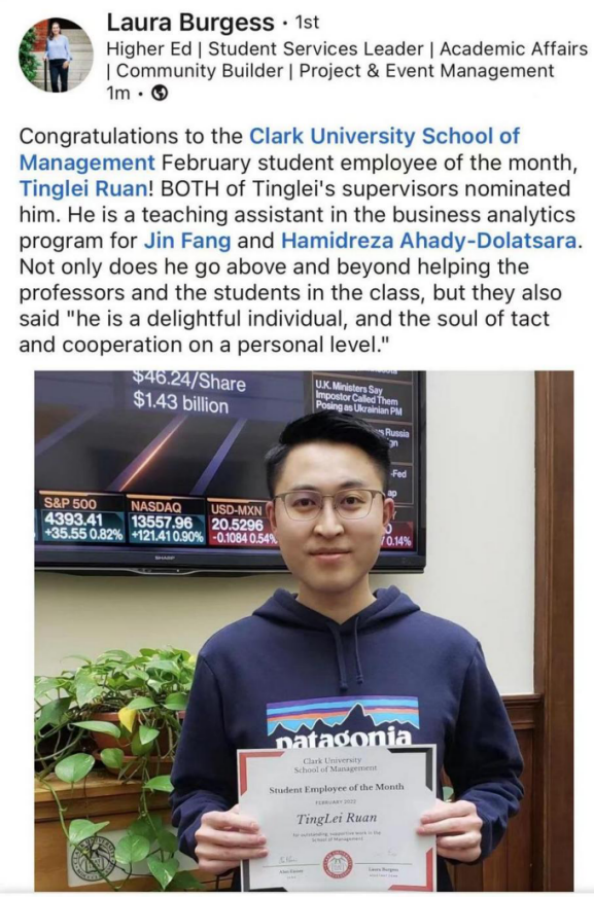 2021届中外国贸学子阮汀磊通过公司与克拉克大学“3+1+1”联合培养项目赴美攻读硕士学位。2022年春季学期在克拉克大学担任Intermediary Statistical Modeling for Analytics和Visual Analytics & Business Intelligence两门课程助教。2022年2月,因协助公司提高教学质量得力,经两位教授提名,阮汀磊被克拉克大学研究生管理公司选为当月“最佳员工雇员”(仅一名)。
