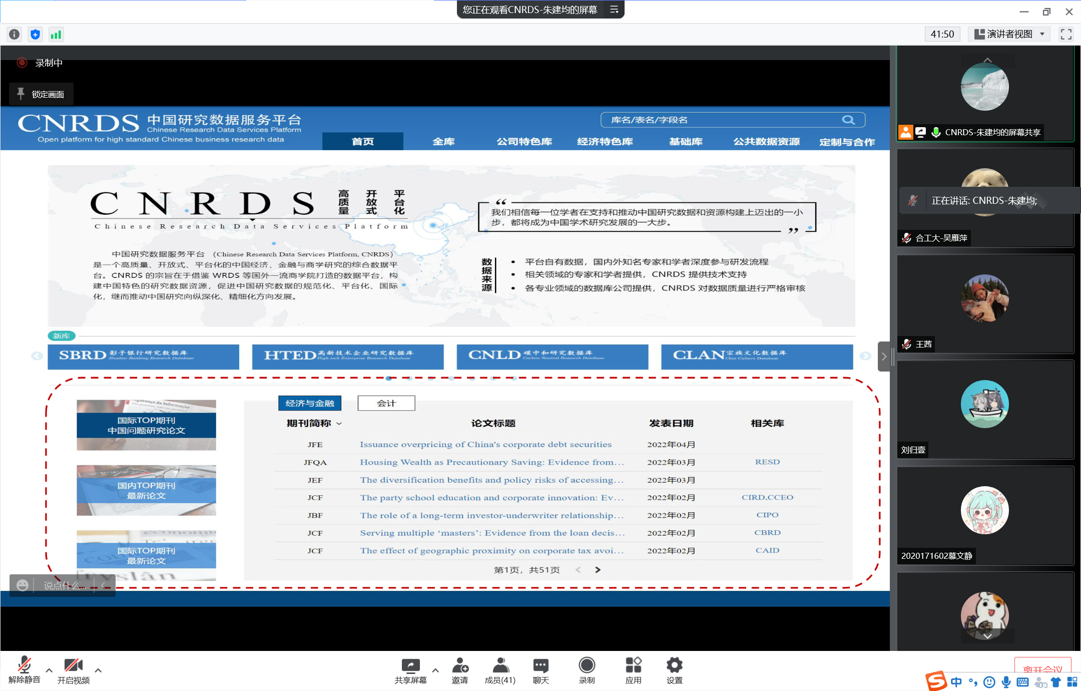 朱建均结合公司的学科方向,重点介绍了CNRDS数据平台所包含的基础数据库和特色数据库,并以绿色专利研究数据库为例介绍了各个数据模块所涉及的特色研究议题。最后,从账号注册、平台简介、数据下载三个方面向同学们展示了平台的功能及数据使用,帮助同学门扩展了研究思路,提升了使用技巧。